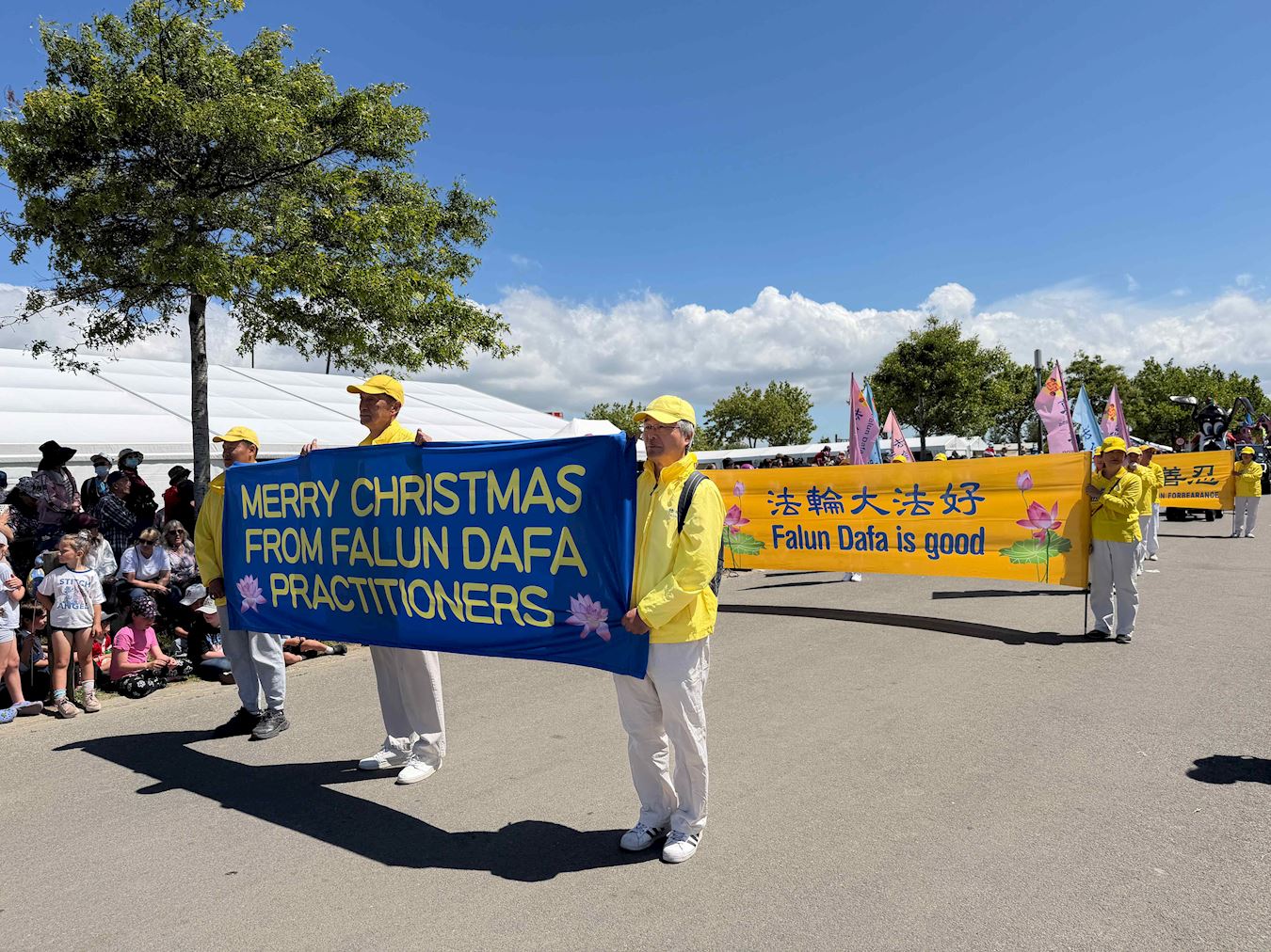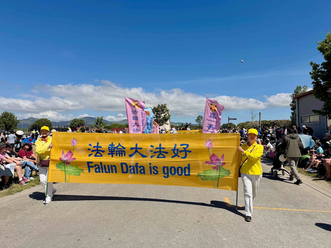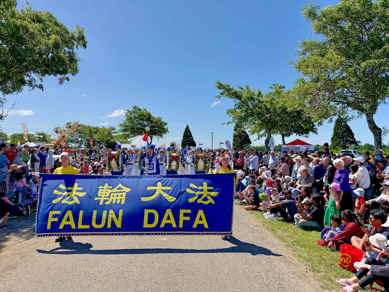 (Minghui.org) Many cities in New Zealand hold Christmas parades at the end of November. This year, Falun Dafa practitioners received invitations from more than 20 cities and districts to join their annual Christmas parades. Their Tian Guo Marching Band, dragon dance, and waist drum teams participated in the parades in Christchurch, Onehunga of Auckland, and Papakura of Auckland, on November 22 and 23, 2025.