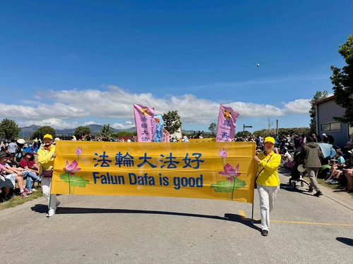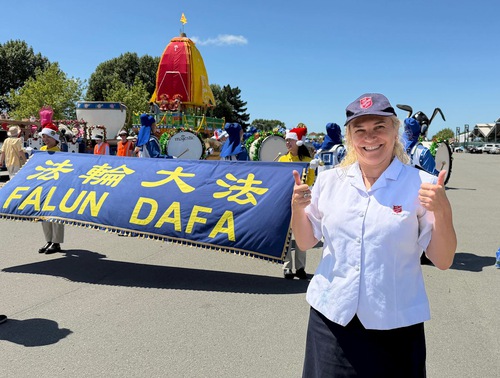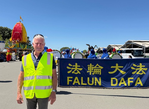 Parade volunteer Mark Scaife commends Falun Dafa practitioners’ entry.