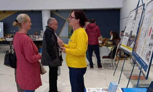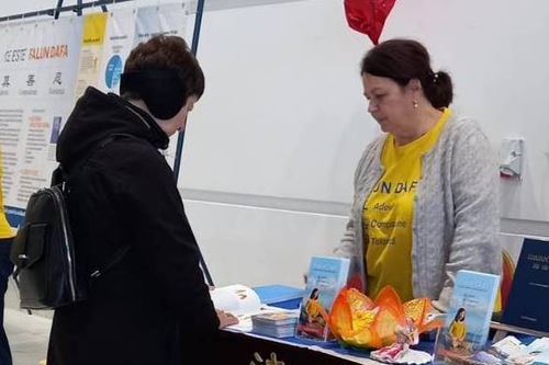 A gentleman in his 60s, a retiree, came to the booth and said that he knew about Falun Dafa from Ezoteric Fest festivals held in previous years. He always liked the Falun Dafa calendars and took them for his family members, children, and grandchildren. He wanted to pay for them, but practitioners said the materials on the table were free so that people could learn how good this practice is and about the persecution in China. Despite all the bad things happening to them, practitioners continue to practice and follow the three principles of Truthfulness, Compassion, Forbearance.