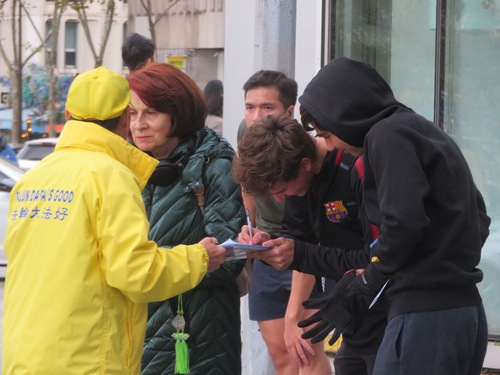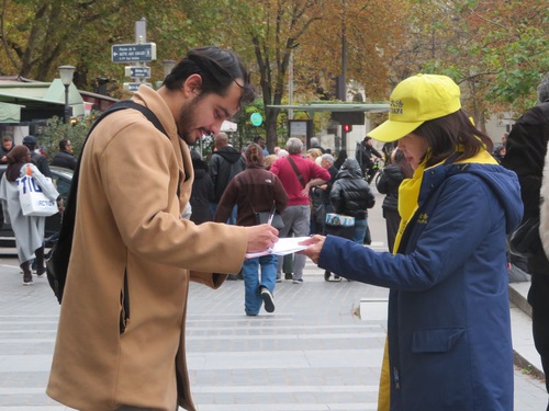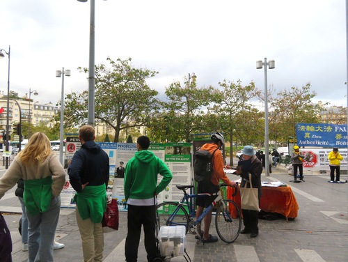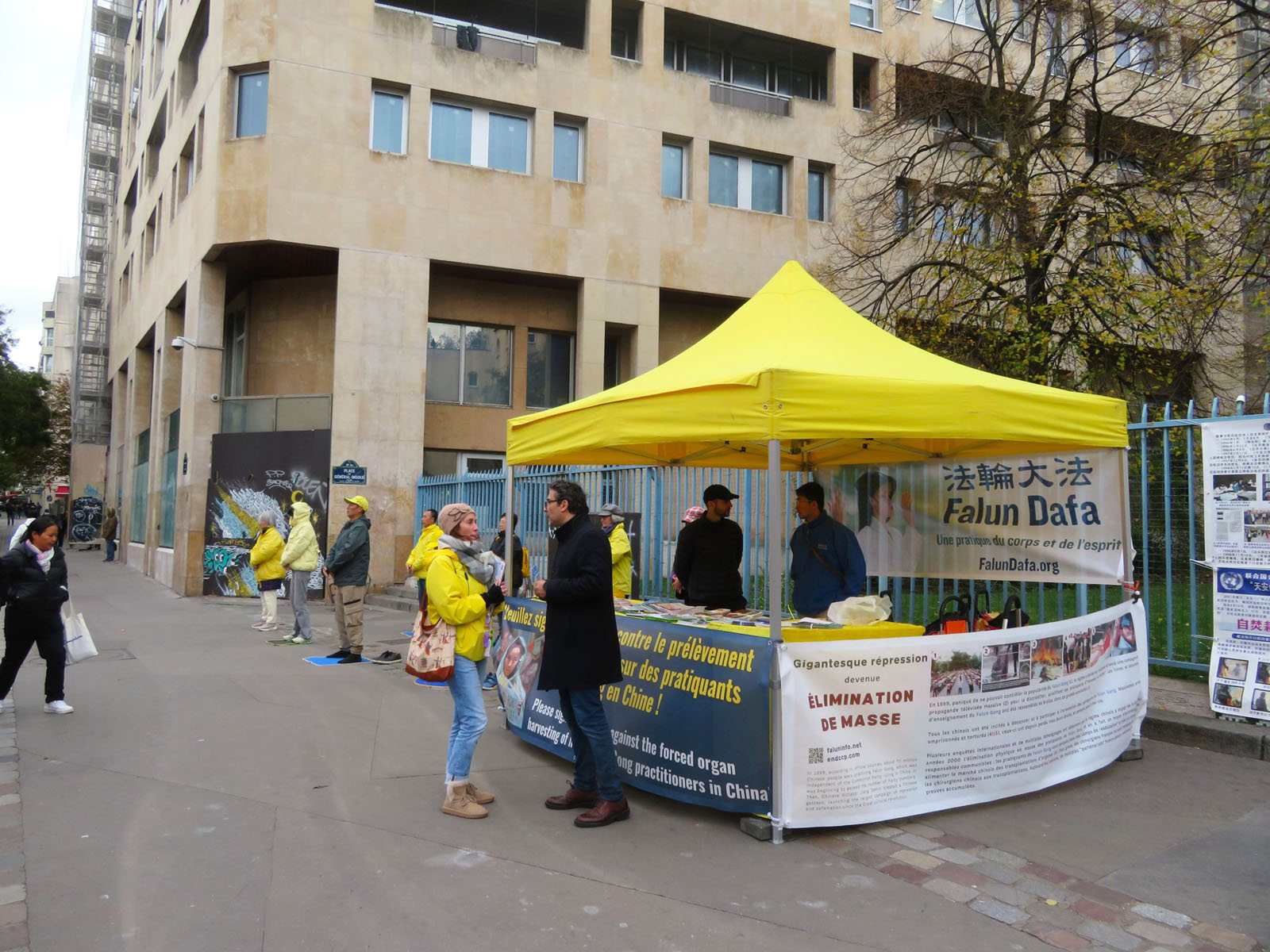 Located in the 13th Arrondissement of Paris, Place d’Italie is located in a large commercial center, with the arrondissement government building located on the other side of the square. Practitioners set up a booth facing the commercial center on Saturday, October 25. People watching practitioners demonstrate the five sets of Falun Gong exercises learned that the Chinese Communist Party (CCP) persecutes those who follow Truthfulness, Compassion, and Forbearance in China. They were also informed about the CCP’s state-sanctioned forced organ harvesting of prisoners of conscience. Stunned and indignant over the atrocities, many people signed the petition calling for an end to the persecution.