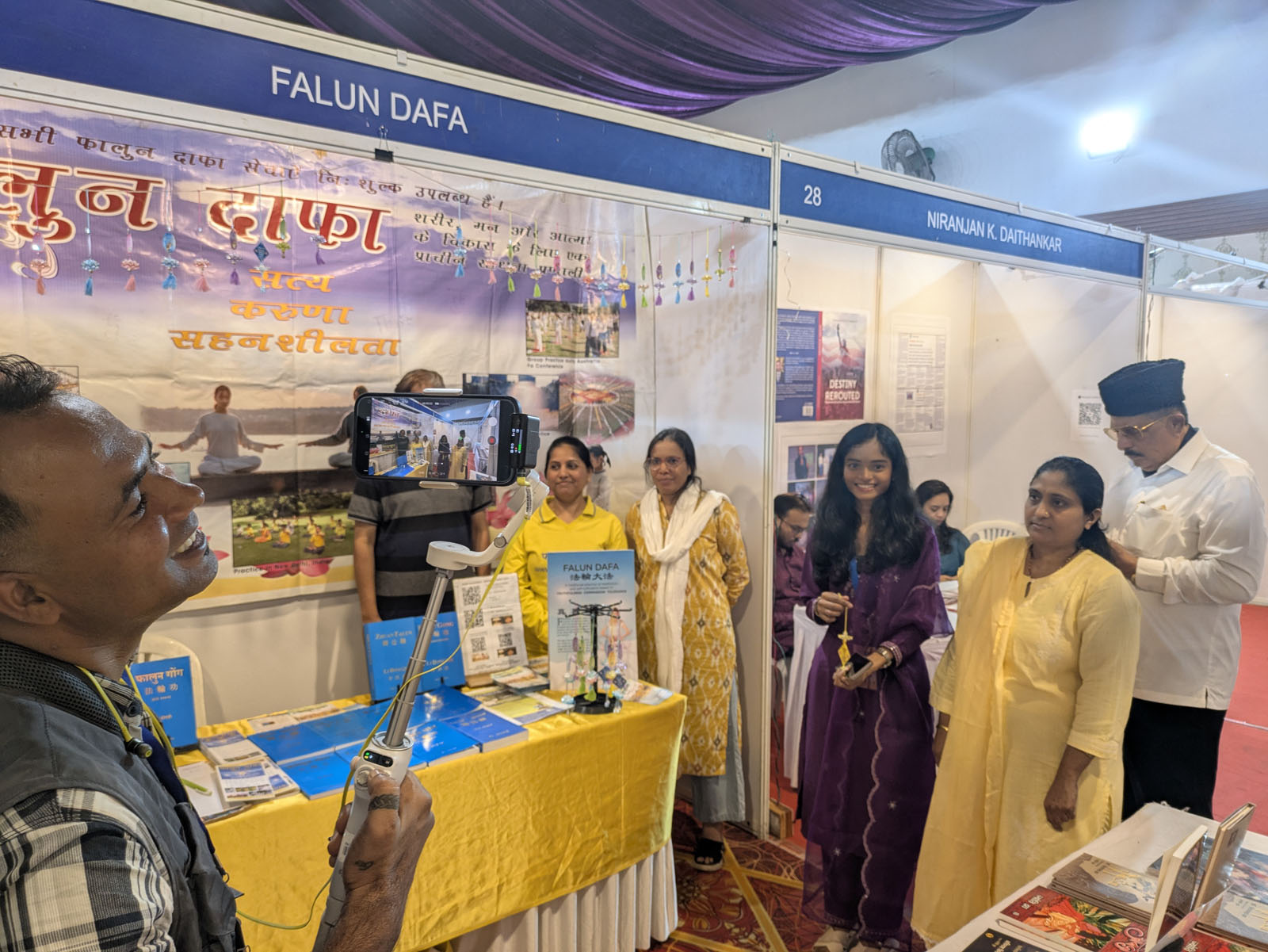 A member of the media takes footage of the Falun Dafa booth at the Pune Book Fair.