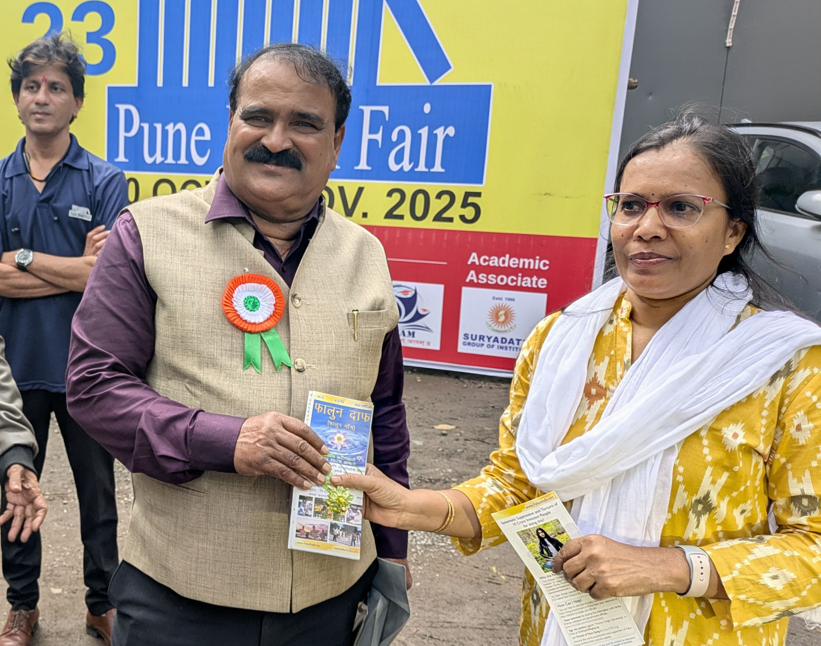 Dr. Sadanand More (left) accepts a flyer from a practitioner at the Falun Dafa booth during the Pune Book Fair.