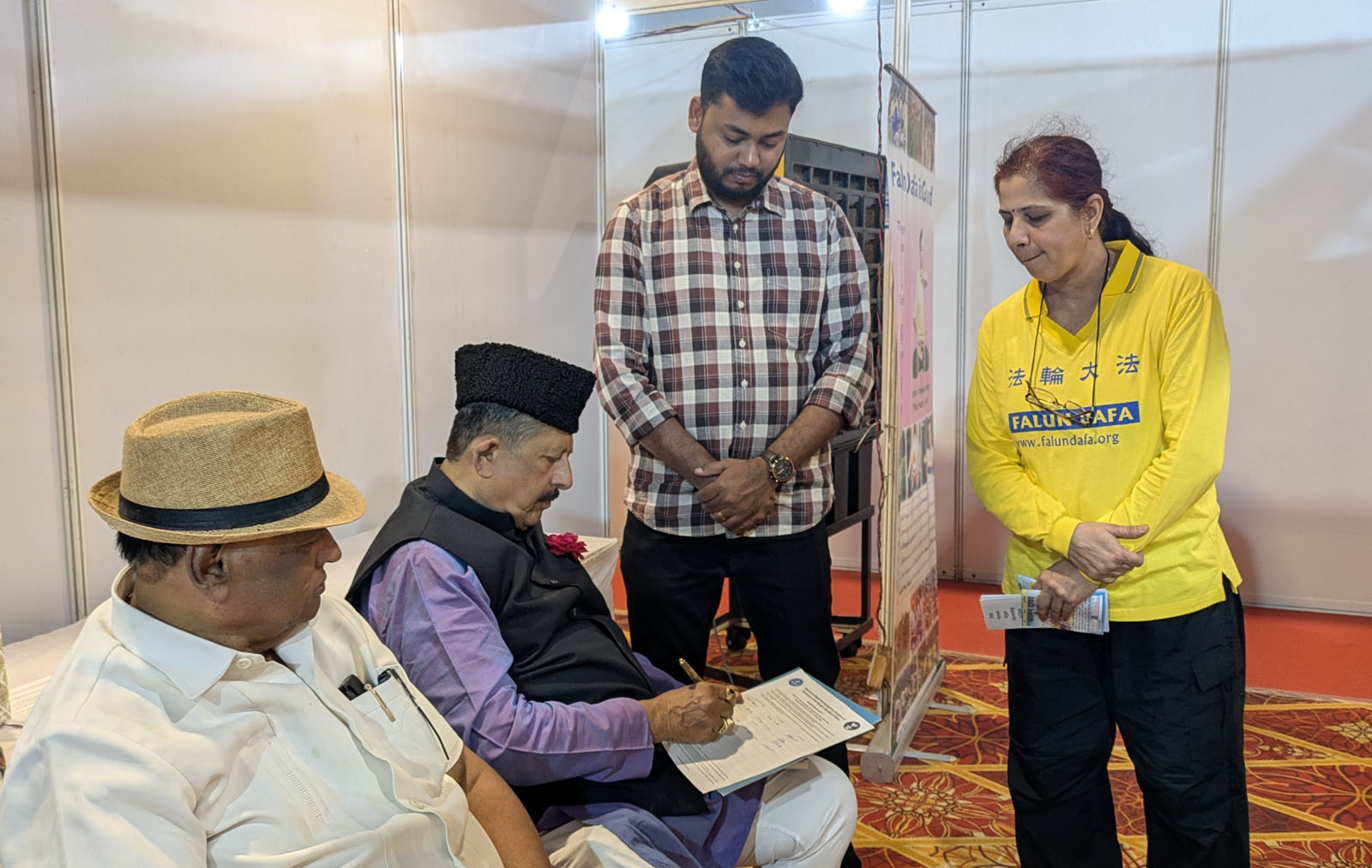 Visitors sign the DAFOH petition at the Falun Dafa booth during the Pune Book Fair.