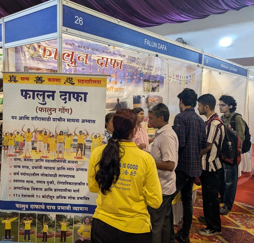 A total of ten Pune-based Falun Dafa practitioners participated, running a dedicated booth at the event to introduce the Falun Dafa cultivation practice to visitors. Practitioners displayed copies of Falun Gong and Zhuan Falun—the two main books of the practice’s teachings—in Hindi, English, and the local Marathi language at the booth.