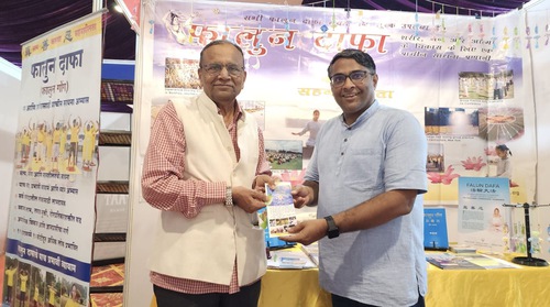 Makarand Ghanekar, a retired banker and avid reader, visited the Falun Dafa stall. He mentioned that he was drawn to the beautifully decorated stall on his way to the program hall and was curious about it. After practitioners introduced Falun Dafa onstage, he came over to the booth to learn more.