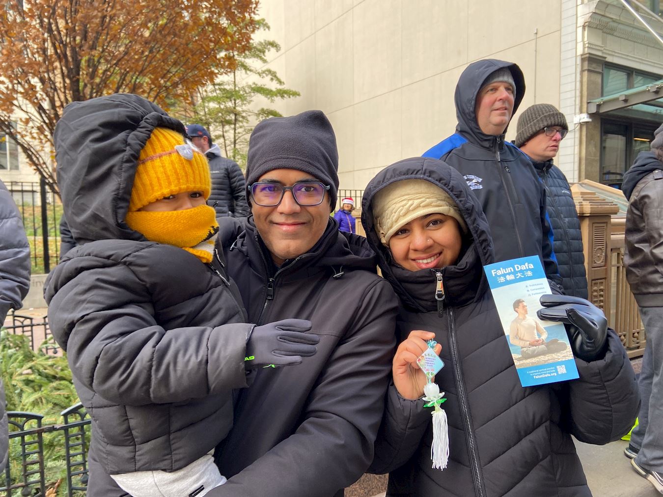 She said that Thanksgiving is a holiday that causes her to reflect and appreciate Falun Dafa all the more. Her parents and children have all benefited from practicing Dafa. “I’m truly grateful to practice cultivation,” she said. “I hope people can feel the positive energy and warmth from Falun Dafa on the cold holiday via this parade.”