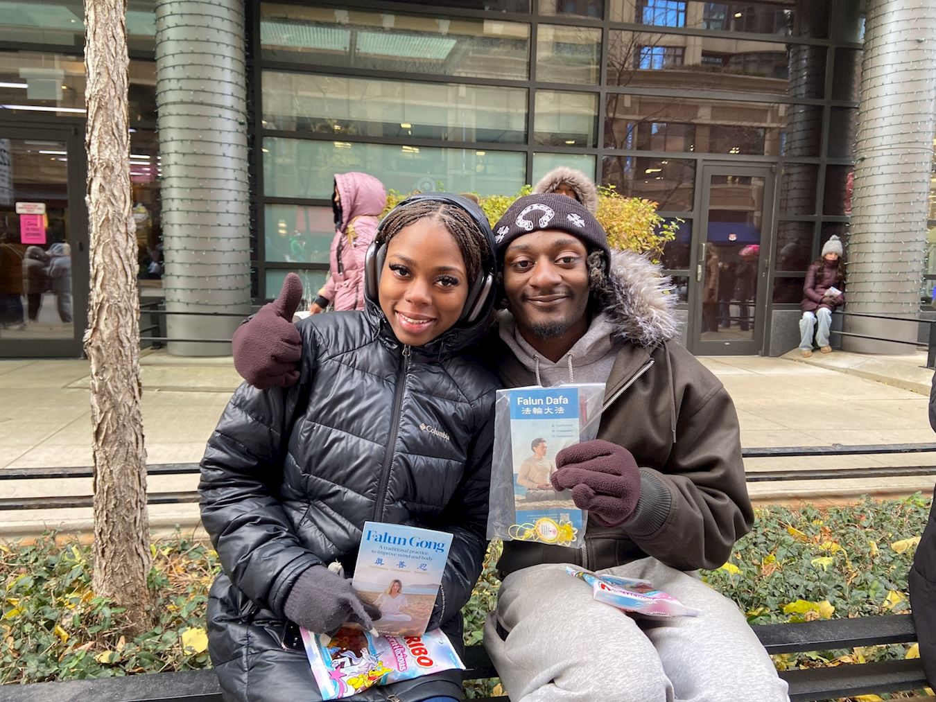 Chicago residents Gomez and his wife Gaby said they were happy to learn about Falun Dafa. Gaby said, “I’d like to learn more about this practice.” She was happy to see the Falun Dafa float. She said, “The float is gorgeous! I’m happy to see you here.”