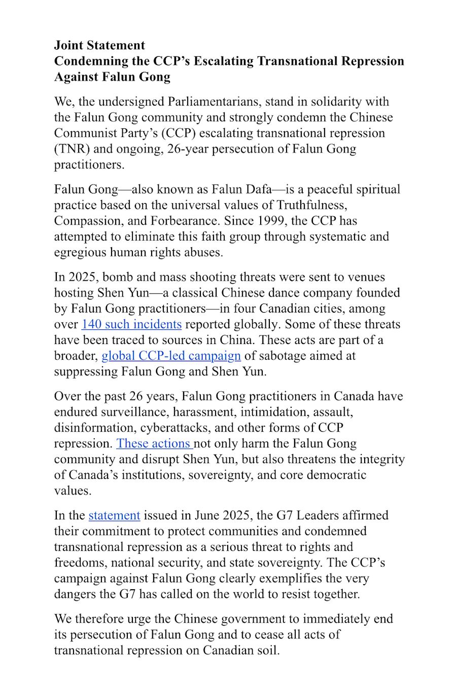 The Joint Statement from Canadian Members of Parliament to condemn the CCP’s escalating transnational repression of Falun Gong.