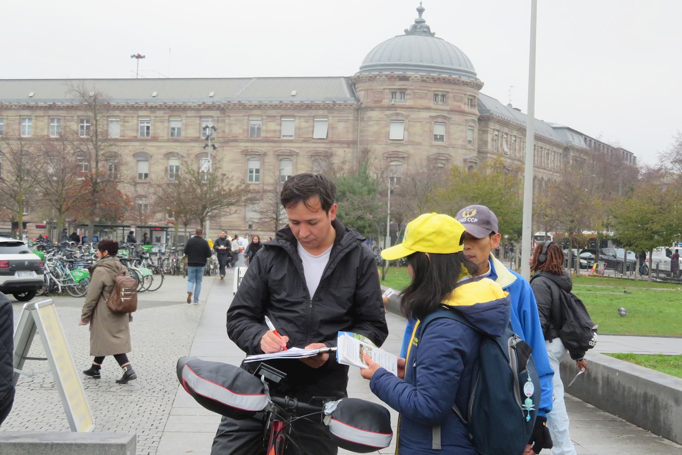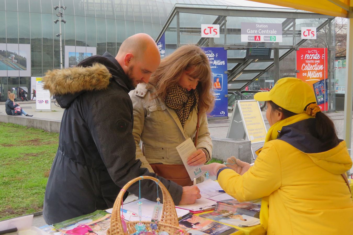 Practitioners introduced Falun Dafa on the square in front of Strasbourg’s train station from December 5 to 7. Many people signed the petition calling for an end to the persecution in China.