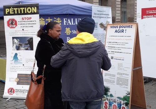 Although it rained lightly that day, on this Saturday before winter break, there was still a large crowd at Place de la République. Practitioners demonstrated the Falun Gong exercises and shared information with passersby. The exercise demonstration drew many to stop and take photographs. Some people also took photos of the information boards. A number of people said they were moved to learn about the persecution, and signed the petition opposing forced organ harvesting. Many people thanked practitioners for being there.