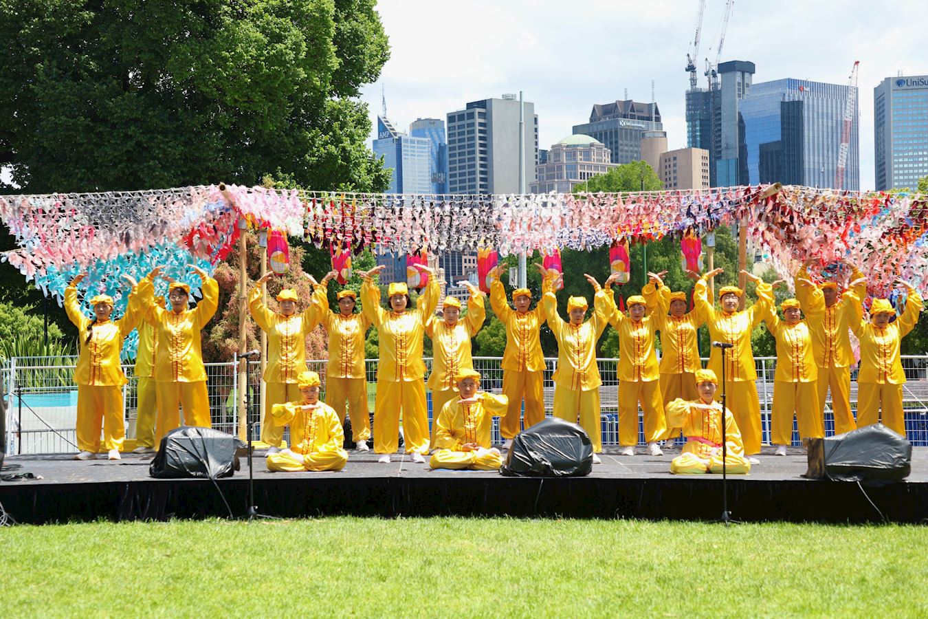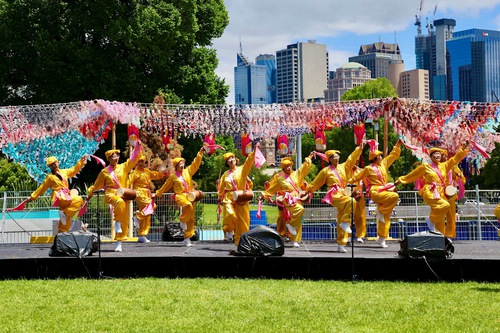 Mr. Li, a member of the Tian Guo Marching Band, said, “We were deeply moved by the sight of so many Australian people listening attentively to our music. Whether it is parades, rallies, or community events like this one, every member of the marching band hopes people see the sacred, golden, radiant banner that says, ‘Falun Dafa is good,’ hear the pure and beautiful music, and feel the compassion and peaceful energy that Falun Dafa practitioners convey to the world through music.