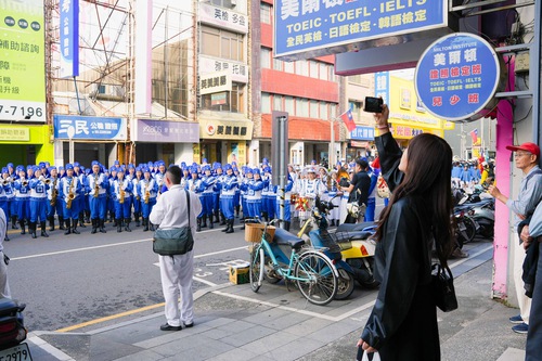 The Tian Guo Marching Band is made up of over 200 Falun Dafa practitioners spanning three generations—elderly, middle-aged and young—and even included practitioners from Japan. They were greeted by cheers as the band marched along Zhongshan Road from Fountain Circle in central Chiayi to Kano Park along the nearly 3-km (almost 2-mile) parade route. The band performed several songs including “Falun Dafa Is Great,” combining their sacred and pure music with synchronized steps, sharing the beauty of Falun Dafa with the festival attendees.