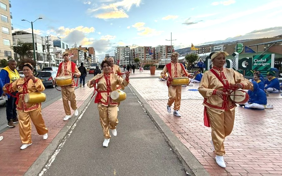 In this environment of open conversation and thought, practitioners contributed their voices to the discussion. They handed out flyers to inform passersby about the benefits of the practice and to help people learn about the persecution of Falun Dafa in China by the Chinese Communist Party (CCP). Practitioners also performed with waist drums, which made an impression on the Tunja residents who were passing by in the afternoon.