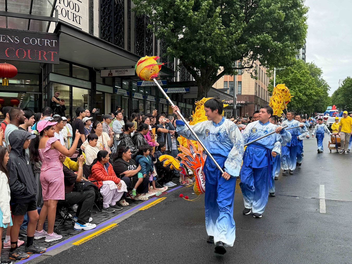 The Tian Guo Marching Band composed of Falun Dafa practitioners from New Zealand and Australia were greeted with warm applause. People took photos, complimented the band on their blue and white outfits, and said the band’s music blended perfectly with the event’s festive atmosphere. Eye-catching “Truthfulness-Compassion-Forbearance” banners decorated the float, which was followed by the dragon dance team, something the children really enjoyed.