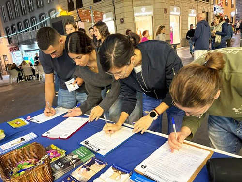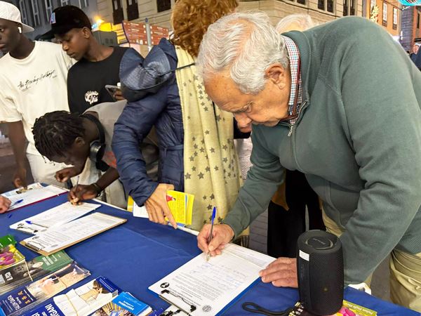 Passersby sign a petition calling for an end to the CCP's persecution.