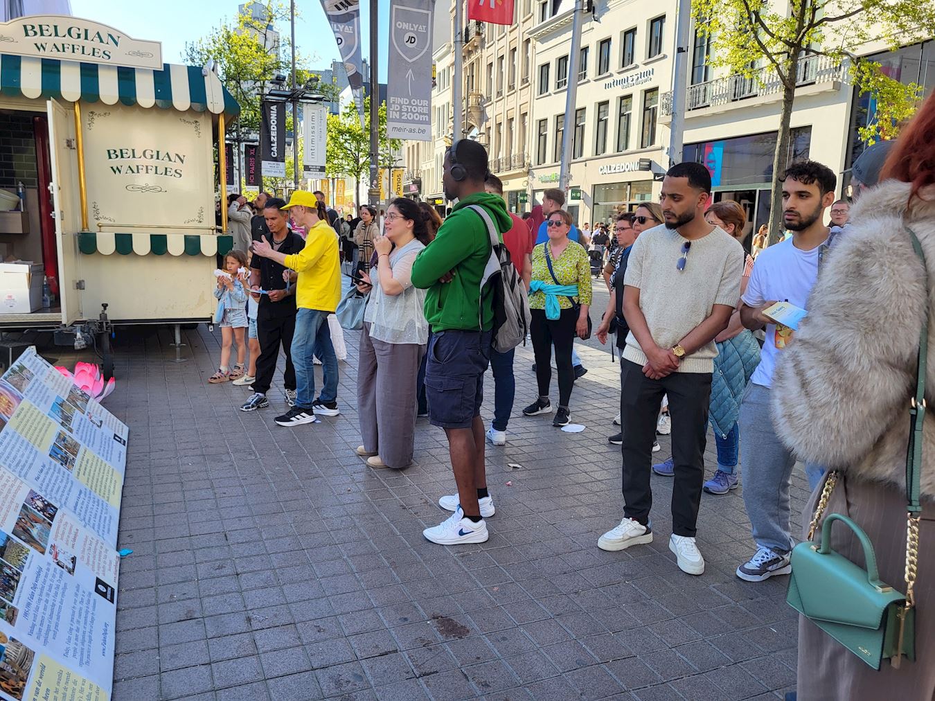 (Minghui.org) Falun Gong practitioners held activities to introduce the spiritual practice to the public on Meir, a busy commercial street in Antwerp, Belgium, on April 12, 2025. They demonstrated the exercises, distributed flyers, and talked to people about the Chinese Communist Party’s (CCP) 26-year persecution of Falun Gong in China. Their information table under a yellow tent offered materials about the practice in different languages.