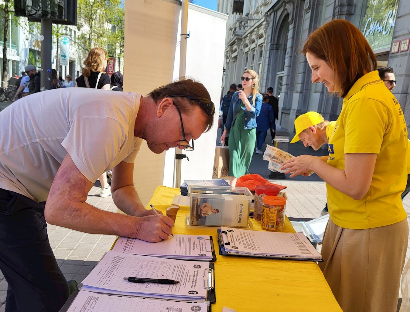 Falun Gong practitioners tell people about the spiritual practice on a busy shopping street in Antwerp.