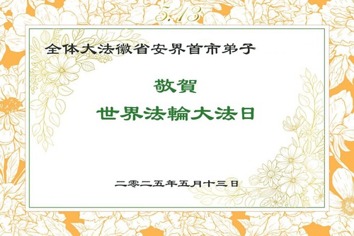 (Minghui.org) May 13, 2025, marks the 26th World Falun Dafa Day and the 33rd anniversary of the public introduction of Falun Dafa. The day is also the birthday of Master Li, the founder of Falun Dafa. Practitioners around the world are sending their heartfelt greetings to celebrate this grand occasion and honor revered Master on this special day.