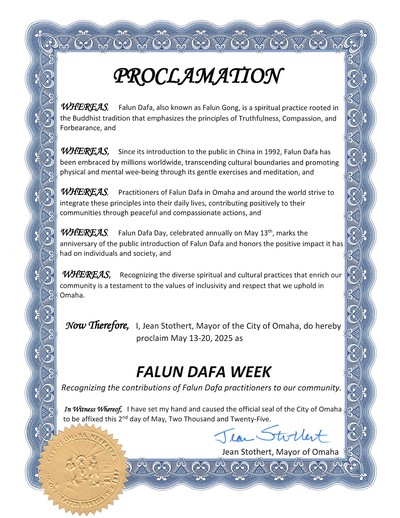 (Minghui.org) The Honorable Jean Stothert, Mayor of Omaha, Nebraska, proclaimed May 13-20, 2025, “Falun Dafa Week.”