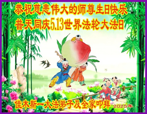 (Minghui.org) May 13, 2025, marks the 26th World Falun Dafa Day and the 33rd anniversary of the public introduction of Falun Dafa. The day is also the birthday of Master Li, the founder of Falun Dafa. Practitioners around the world send their heartfelt greetings to celebrate this grand occasion and honor revered Master on this special day.