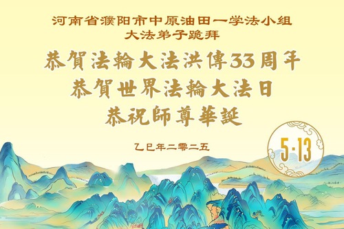 (Minghui.org) May 13, 2025, marks the 26th World Falun Dafa Day and the 33rd anniversary of the public introduction of Falun Dafa. The day is also the birthday of Master Li, the founder of Falun Dafa. Practitioners around the world send their heartfelt greetings to celebrate this grand occasion and honor revered Master on this special day.