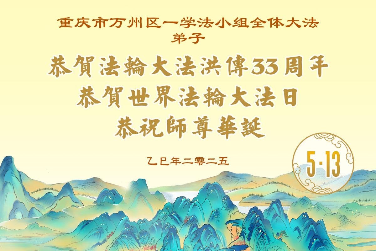 (Minghui.org) May 13, 2025, marks the 26th World Falun Dafa Day and the 33rd anniversary of the public introduction of Falun Dafa. The day is also the birthday of Master Li Hongzhi, the founder of Falun Dafa. Practitioners around the world are sending their heartfelt greetings to celebrate this grand occasion and honor revered Master on this special day.