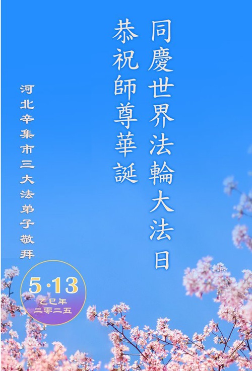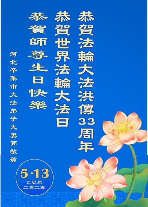 (Minghui.org) May 13, 2025, marks the 26th World Falun Dafa Day and the 33rd anniversary of the public introduction of Falun Dafa. The day is also the birthday of Master Li, the founder of Falun Dafa. Practitioners around the world send their heartfelt greetings to celebrate this grand occasion and honor revered Master on this special day.