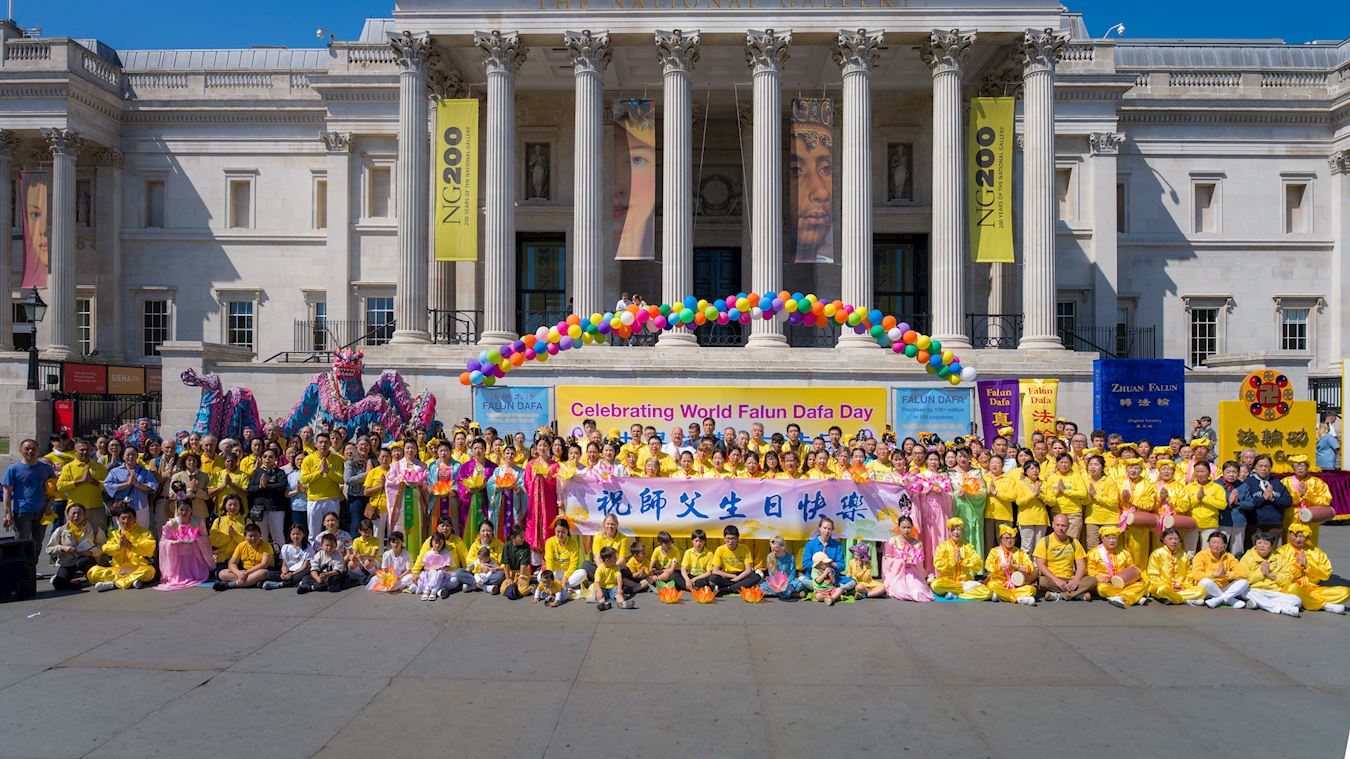 (Minghui.org) Practitioners held a grand parade and rally in the center of London on May 10, 2025, to celebrate the 26th World Falun Dafa Day, which falls on May 13. This day is also the 33rd anniversary of the public introduction of the spiritual practice and the birthday of its founder, Master Li Hongzhi.
