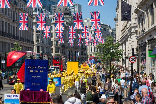 Practitioners’ grand parade in London on May 10 celebrated World Falun Dafa Day.