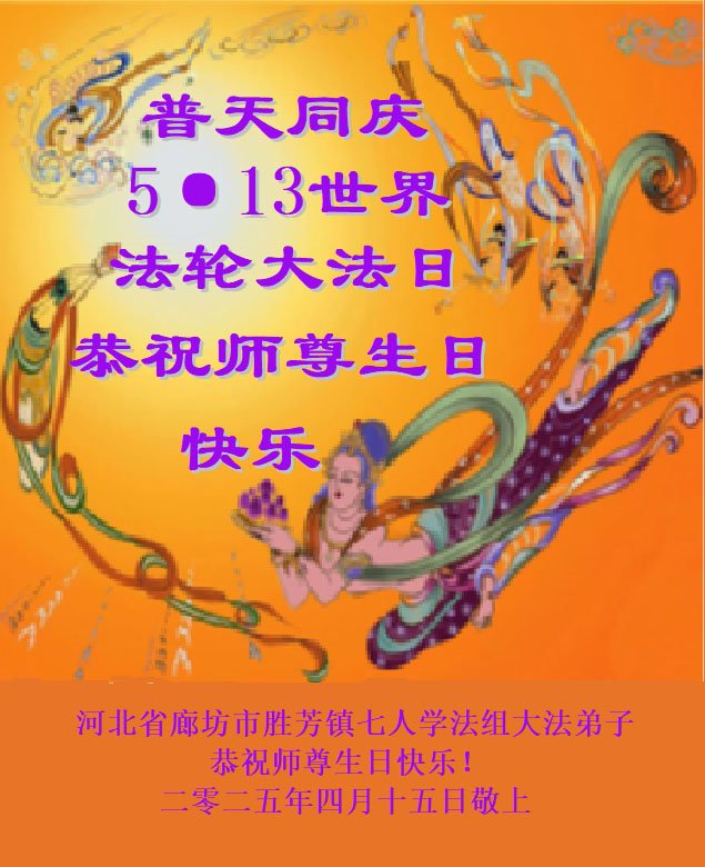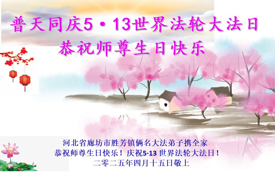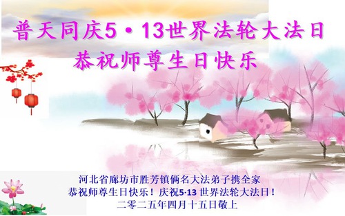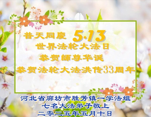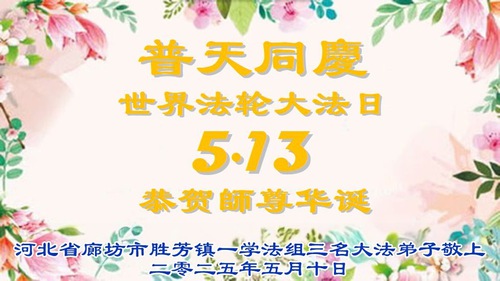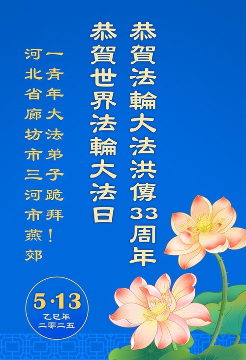 (Minghui.org) May 13, 2025, marks the 26th World Falun Dafa Day and the 33rd anniversary of the public introduction of Falun Dafa. The day is also the birthday of Master Li, the founder of Falun Dafa. Practitioners around the world convey their heartfelt greetings to celebrate this grand occasion and to honor revered Master on this special day.