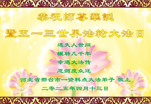 (Minghui.org) May 13, 2025, marks the 26th World Falun Dafa Day and the 33rd anniversary of the public introduction of Falun Dafa. The day is also the birthday of Master Li, the founder of Falun Dafa. Practitioners around the world convey their heartfelt greetings to celebrate this grand occasion and honor revered Master on this special day.