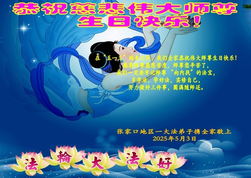 (Minghui.org) May 13, 2025, marks the 26th World Falun Dafa Day and the 33rd anniversary of the public introduction of Falun Dafa. The day is also the birthday of Master Li, the founder of Falun Dafa. Practitioners around the world convey their heartfelt greetings to celebrate this grand occasion and to honor revered Master on this special day.