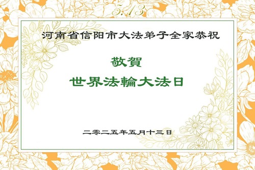 (Minghui.org) May 13, 2025, marks the 26th World Falun Dafa Day and the 33rd anniversary of the public introduction of Falun Dafa. The day is also the birthday of Master Li Hongzhi, the founder of Falun Dafa. Practitioners around the world are sending their heartfelt greetings to celebrate this grand occasion and honor revered Master on this special day.