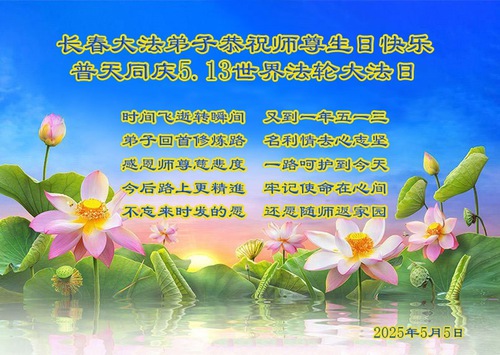 (Minghui.org) May 13, 2025, marks the 26th World Falun Dafa Day and the 33rd anniversary of the public introduction of Falun Dafa. The day is also the birthday of Master Li, the founder of Falun Dafa. Practitioners around the world are sending their heartfelt greetings to celebrate this grand occasion and honor revered Master on this special day.