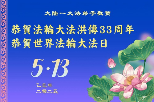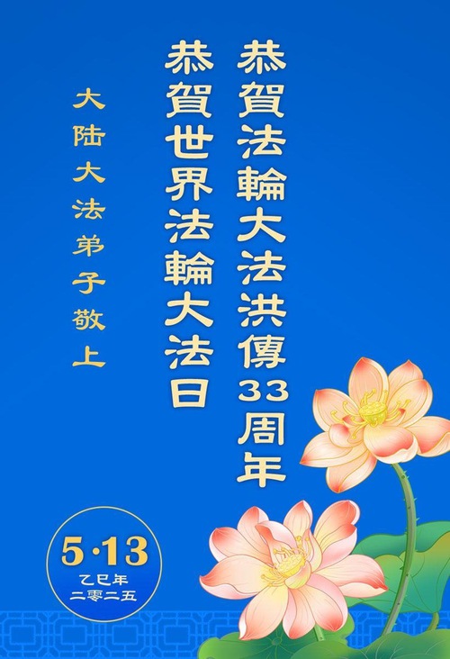 (Minghui.org) May 13, 2025, marks the 26th World Falun Dafa Day and the 33rd anniversary of the public introduction of Falun Dafa. The day is also the birthday of Master Li, the founder of Falun Dafa. Practitioners around the world send their heartfelt greetings to celebrate this grand occasion and honor revered Master on this special day.