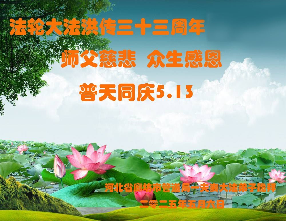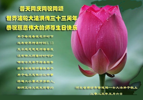 (Minghui.org) May 13, 2025, marks the 26th World Falun Dafa Day and the 33rd anniversary of the public introduction of Falun Dafa. The day is also the birthday of Master Li, the founder of Falun Dafa. Practitioners around the world convey their heartfelt greetings to celebrate this grand occasion and honor revered Master on this special day.