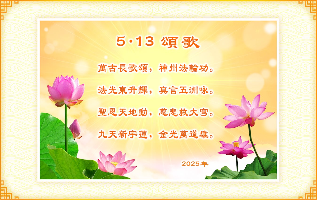 (Minghui.org) May 13, 2025, marks the 26th World Falun Dafa Day and the 33rd anniversary of the public introduction of Falun Dafa. The day is also the birthday of Master Li, the founder of Falun Dafa. Practitioners around the world convey their heartfelt greetings to celebrate this grand occasion and honor revered Master on this special day.