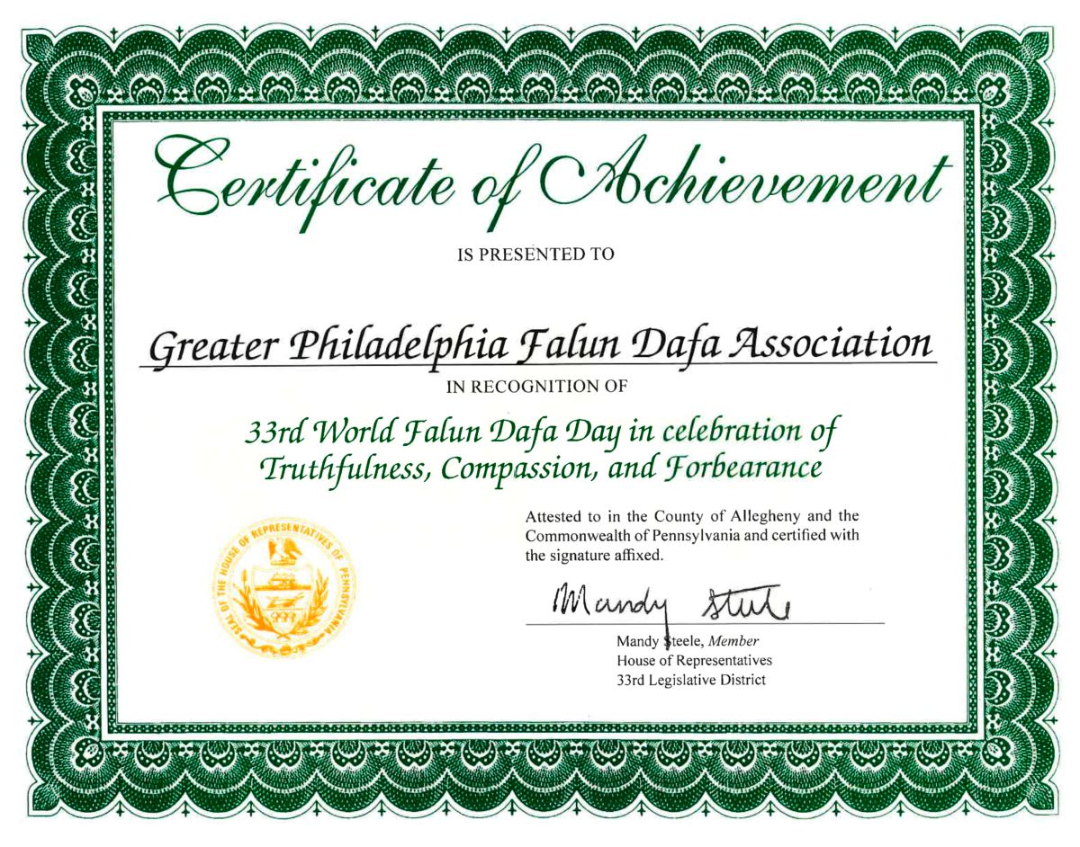 The certificate of achievement “is presented to Greater Philadelphia Falun Dafa Association in recognition of 33rd World Falun Dafa Day in celebration of Truthfulness, Compassion and Forbearance.”