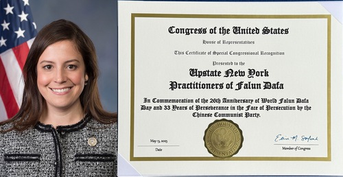 Rep. Elise Stefanik wrote, “This Certificate of Special Congressional Recognition presented to the Upstate New York practitioners of Falun Dafa, in commemoration of the 26th anniversary of World Falun Data Day and 33 years of perseverance in the face of persecution by the Chinese Communist Party.”