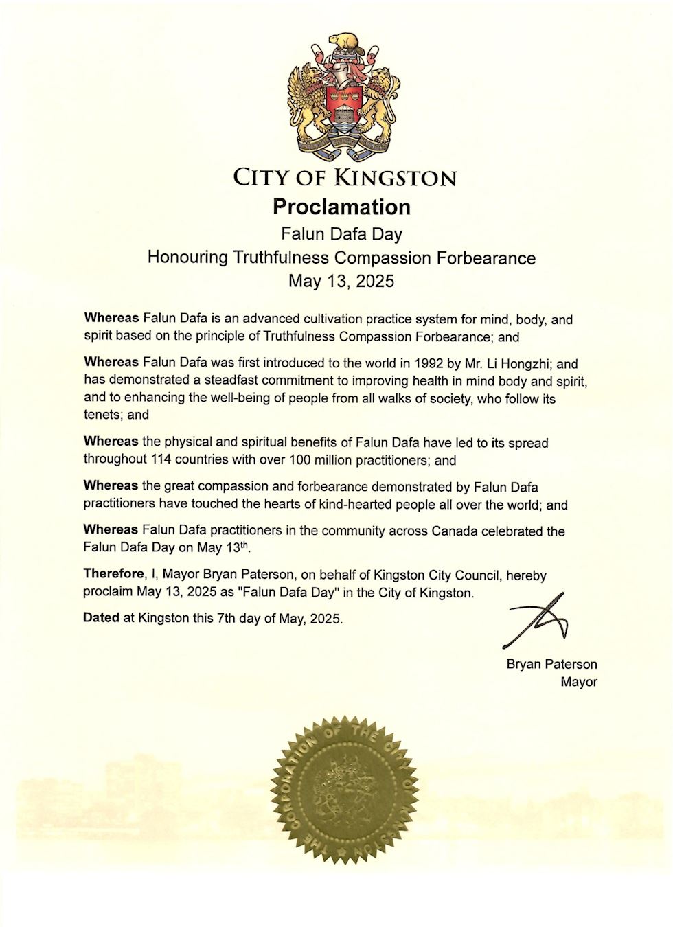 “Whereas Falun Dafa practitioners in the community across Canada celebrated the Falun Dafa Day on May 13th. Therefore, I, Mayor Bryan Paterson, on behalf of Kingston City Council, hereby proclaim May 13, 2025 as “Falun Dafa Day” in the City of Kingston.”