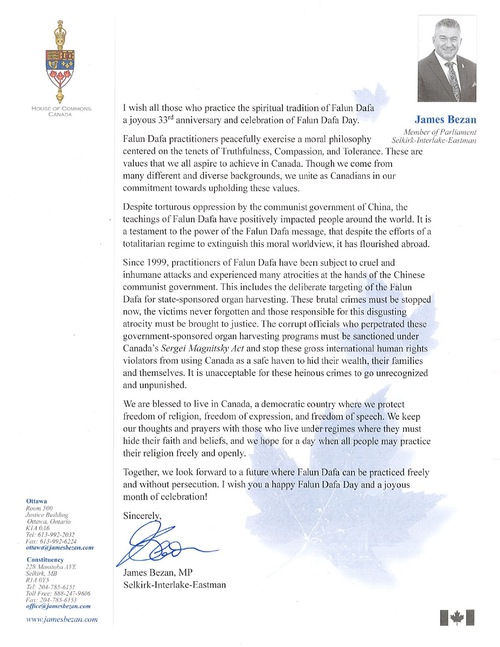 James Bezan MP stated in his letter, “I wish all those who practice the spiritual tradition of Falun Dafa a joyous 33rd anniversary and celebration of Falun Dafa Day. Falun Dafa practitioners peacefully exercise a moral philosophy centered on the tenets of Truthfulness, Compassion, and Tolerance. These are values that we all aspire to achieve in Canada. Though we come from many different and diverse backgrounds, we unite as Canadians in our commitment towards upholding these values.