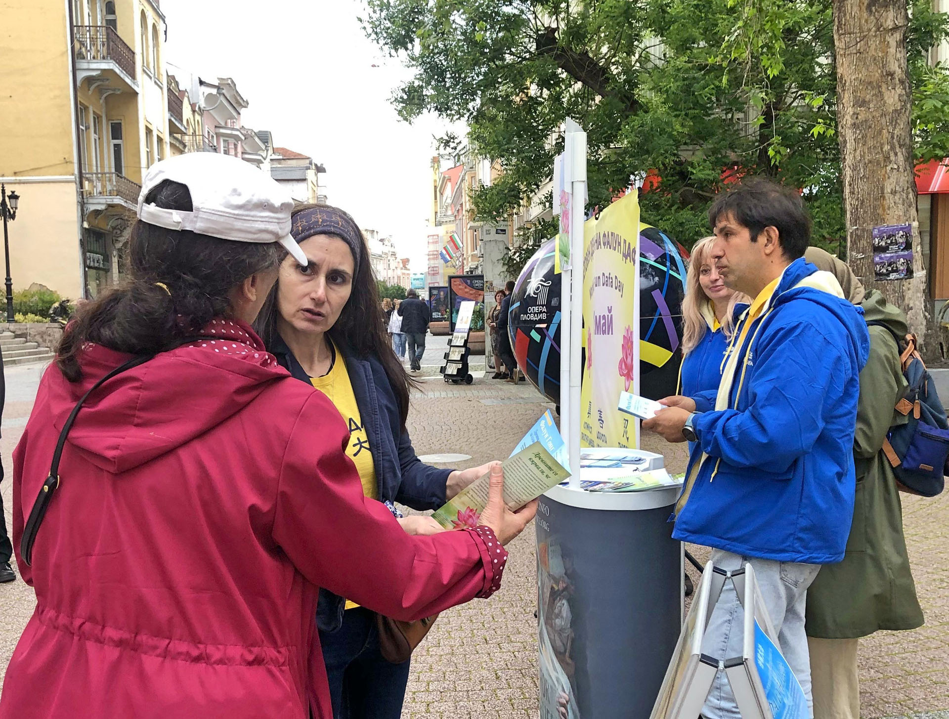 Falun Dafa practitioners set up an information booth in Plovdiv to introduce Falun Dafa to passersby on May 13, 2025.