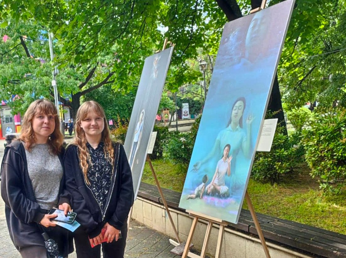 Passersby looked at the paintings with interest and listened to practitioners explain the background of these artworks. A couple was impressed that the paintings were based on practitioners’ real experiences. The man commented that “the atheism of communist regimes is detrimental to people,” and expressed his support for Falun Dafa, which is bringing faith back to China.