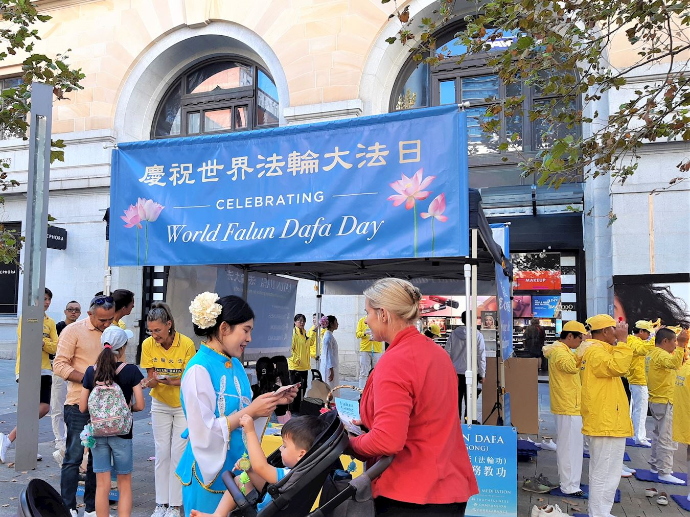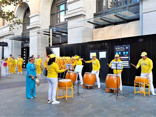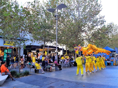 (Minghui.org) Falun Dafa practitioners in Western Australia held a rally at the Murray Street Mall in Perth’s city center on May 17, 2025. They told people about Falun Dafa, demonstrated the exercises, and gave performances to celebrate the 26th World Falun Dafa Day, which is also the birthday of Falun Dafa’s founder, Mr. Li Hongzhi. Many residents stopped to watch, and some praised Falun Dafa’s principles, Truthfulness, Compassion, and Forbearance.