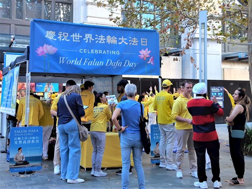 Practitioners kicked off the day’s event by doing the exercises, accompanied by the peaceful and melodious music in front of the information booth. Many people said they were interested in learning more and accepted information about Falun Dafa.