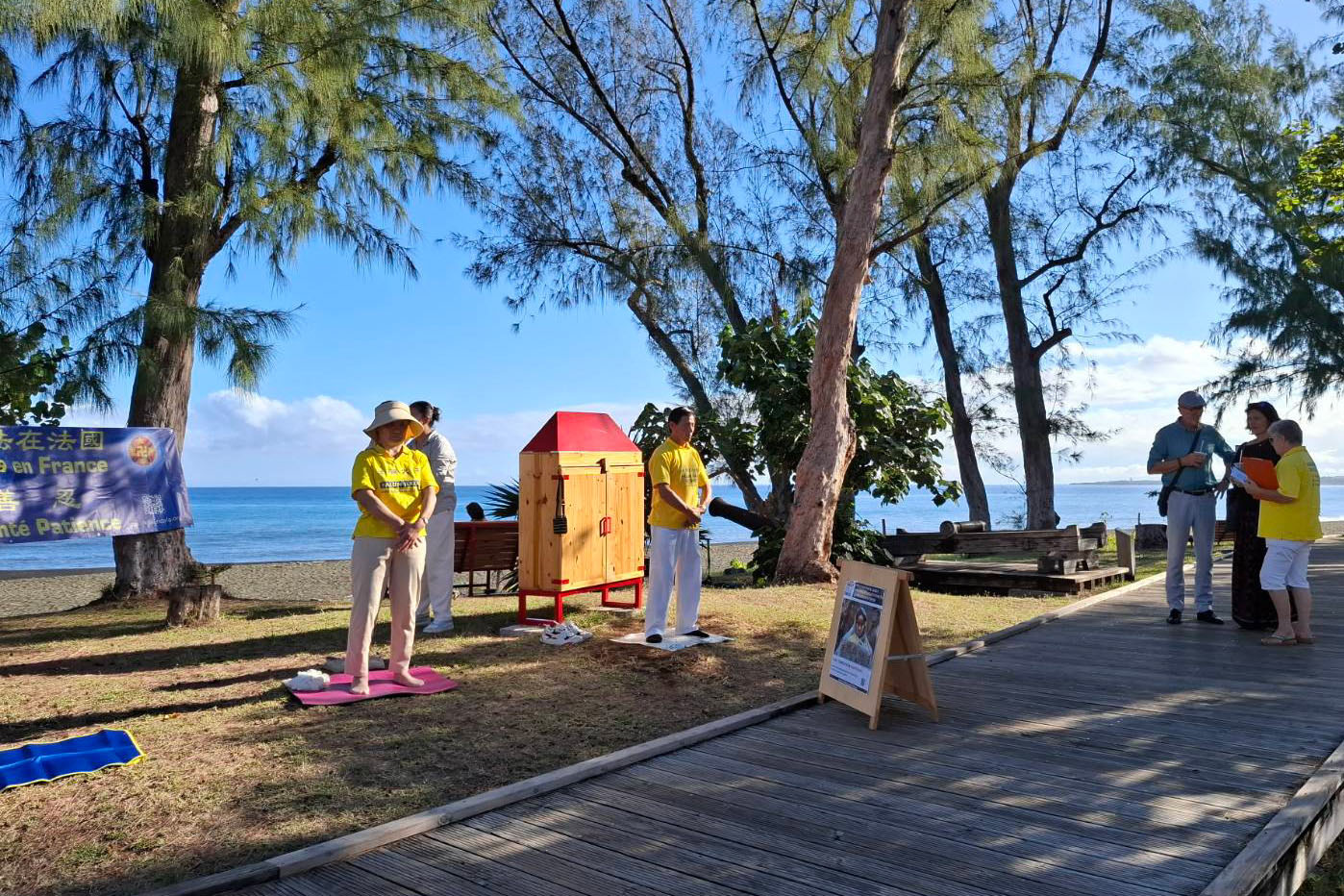 Falun Dafa practitioners on Reunion Island, France held an event at the Sao Paulo waterfront on May 17, 2025 to celebrate World Falun Dafa Day. Apart from large banners and truth-clarifying display boards, the practitioners also demonstrated the exercises and distributed fliers to introduce the goodness of cultivating in Falun Dafa to passers-by.