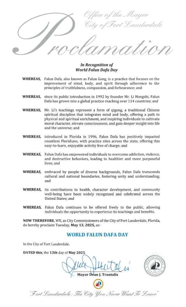 Mayor Dean J. Trantalis of Fort Lauderdale, Florida, along with four city commissioners, officially declared May 13, 2025, as “Falun Dafa Day” in the City of Fort Lauderdale.