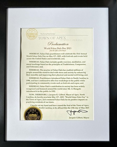 The cities of Cary, Apex, and Jacksonville in North Carolina issued proclamations and declared May 13, 2025 “World Falun Dafa Day,” thanking Falun Dafa for its contributions to the local communities.