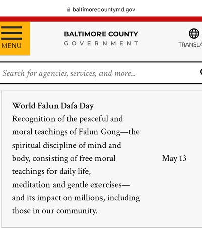 The Baltimore County government declared May 13 World Falun Dafa Day in the county on its website.