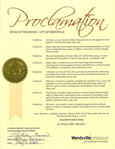 Mayors of the cities of O’Fallon and Wentzville in Missouri, issued proclamations praising Falun Dafa for bringing well-being to individuals and the community, and declared May 13, 2025, Falun Dafa Day.